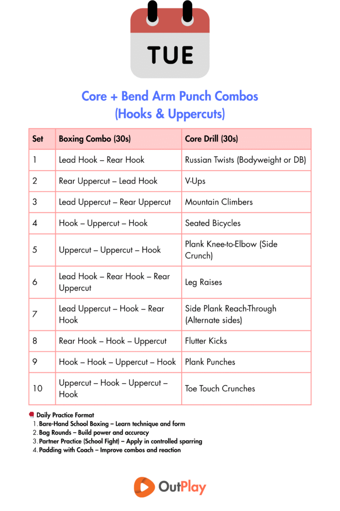 - Core Punch Sit-Ups (sit-up + 2 straight punches) β 2 rounds